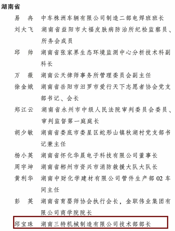 為表彰先進(jìn)、樹立榜樣,進(jìn)一步引領(lǐng)和激勵廣大婦女堅(jiān)定不移聽黨話、跟黨奮進(jìn)新征程,豪情滿懷、意氣風(fēng)發(fā)投入推進(jìn)中國式現(xiàn)代化的偉大實(shí)踐,日前,全國婦聯(lián)決定授予10人全國三八紅旗手標(biāo)兵稱號,298人全國三八紅旗手稱號,授予199個單位全國三八紅旗集體稱號,其中,來自桃源的湖南三特機(jī)械制造有限公司技術(shù)部部長 邱寶珠 獲得全國三八紅旗手榮譽(yù)。